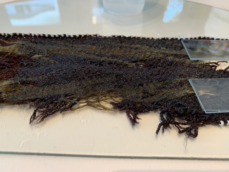 Paper, unless it undergoes a special process, is inherently acidic; the wool that is the primary fabric is also inherently acidic. Together, this overly acidic environment caused extreme brittleness of the actual fibers of the textile. It was so brittle, that when I started to carefully remove it from the bag, some of the long tassels were already broken off from the body of the sash. Therefore, it was really important that this sash undergo a special set of baths to try and neutralize the acidity and thus allow the fibers to relax back into place.