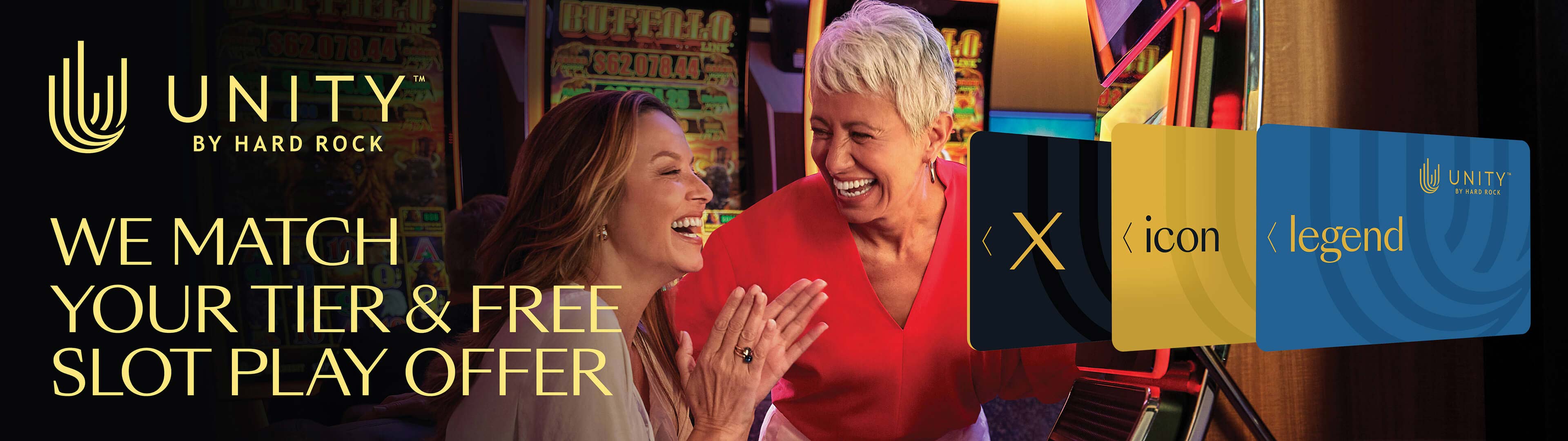 Show us your premium tier card from select competitor casinos for an opportunity to match your tier with the equivalent Unity By Hard Rock tier. Plus, when we match your tier, we also match any single, unexpired free play offer from a non-Unity South Florida Casino!