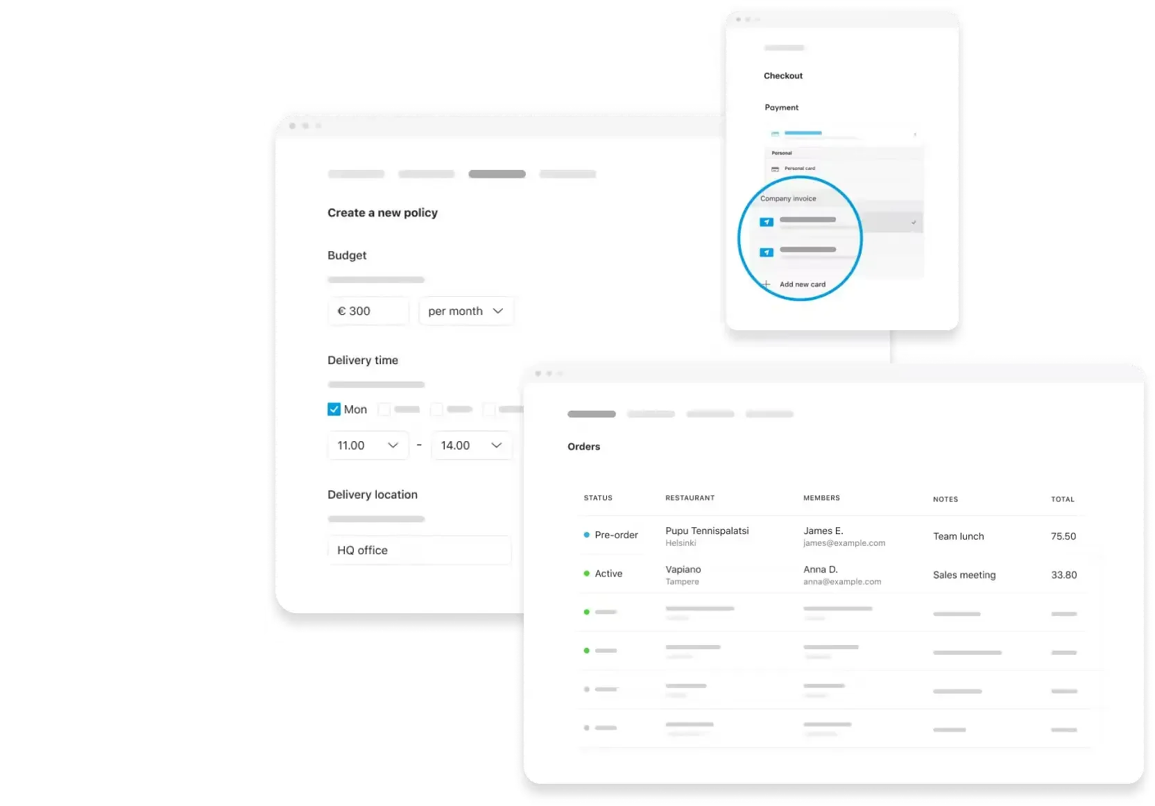 Give food budgets. Set times when teams can order food. Choose addresses for delivery orders. Teams can order and track their food in real-time through Wolt app or wolt.com.