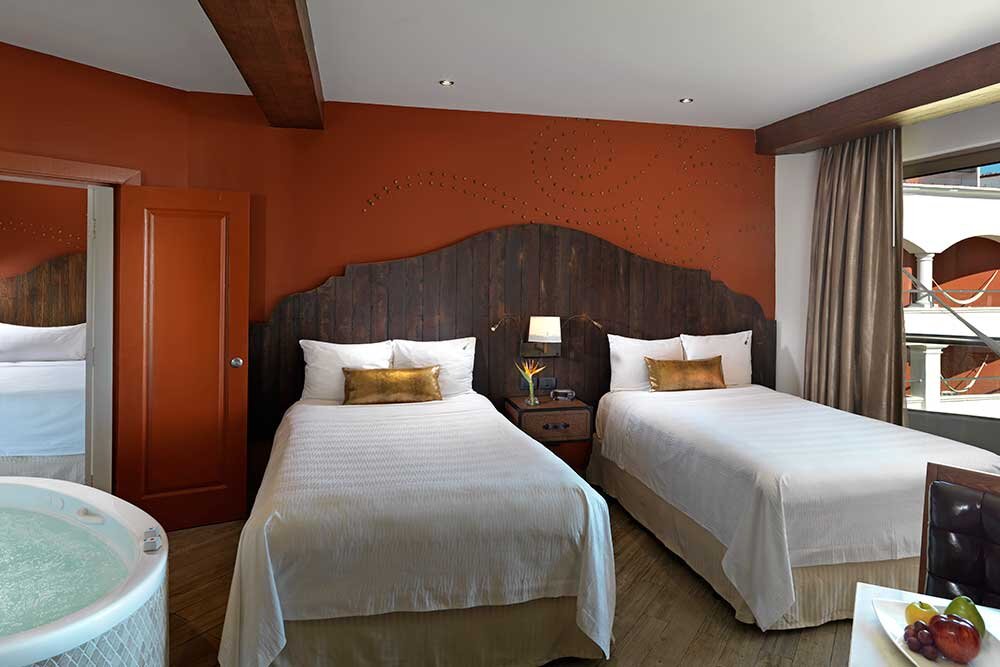 Two bedroom suite, one room with a king bed, and a second room with two double beds. All of your Rock Royalty Level amenities are already included in this room category so you may rock on– my highness.