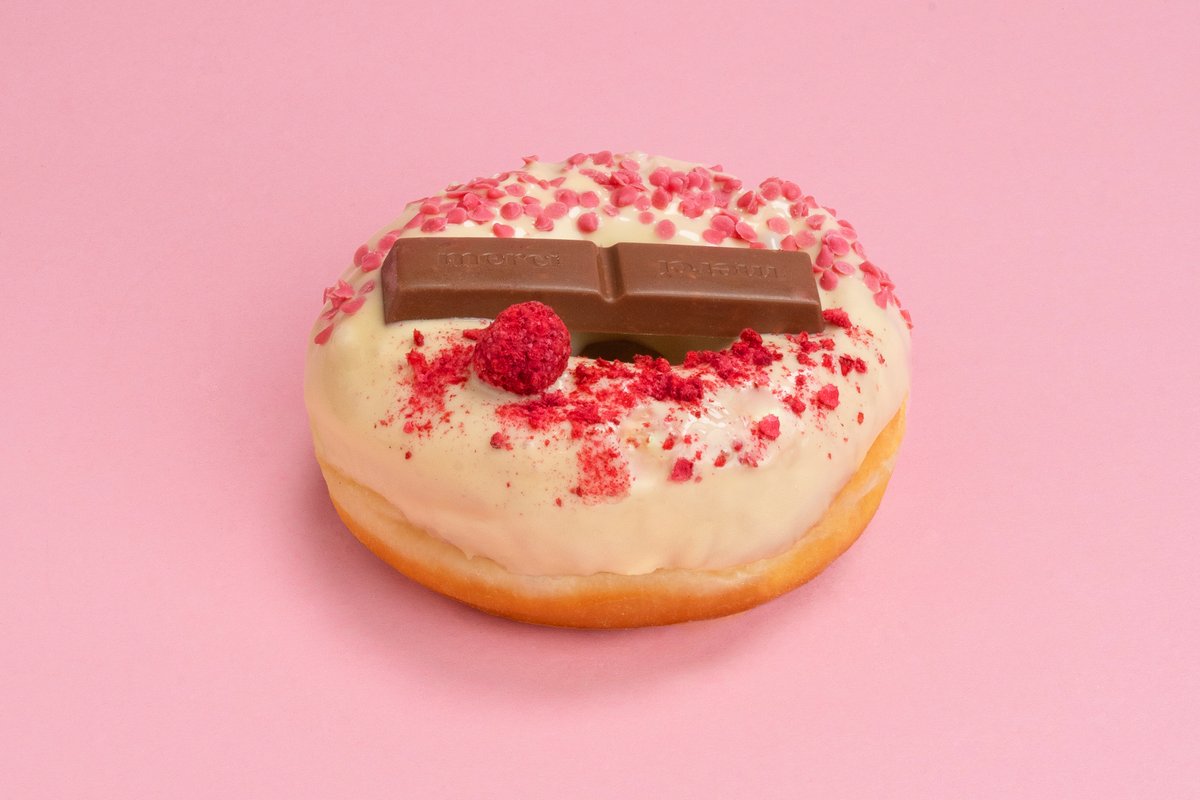Our soft donut filled with smooth raspberry cream, dipped in silky white chocolate, and topped with a Merci chocolate piece and a sprinkle of freez-dried raspberries. Sweet, elegant, and irresistibly fruity.