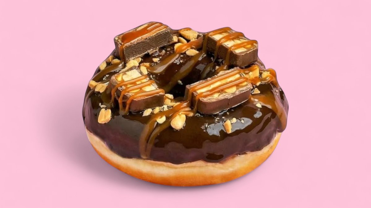Our fluffy donut filled with creamy peanut butter dipped in rich dark chocolate and topped with Snickers pieces and crunchy peanuts. Perfect for peanut-chocolate lovers!