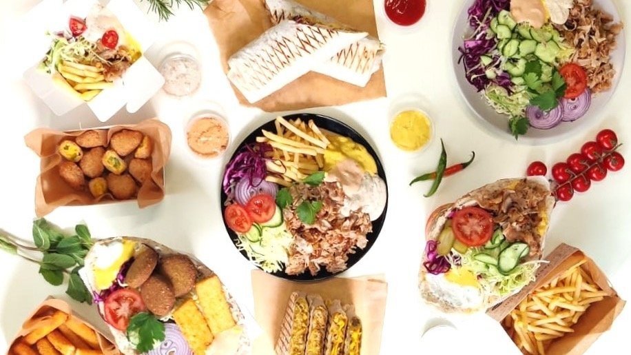 falafel / halloumi sýr / velká porce falafelu / halloumi sýru, zelenina, omáčka, hranolky / rýže / pita, kousek pity