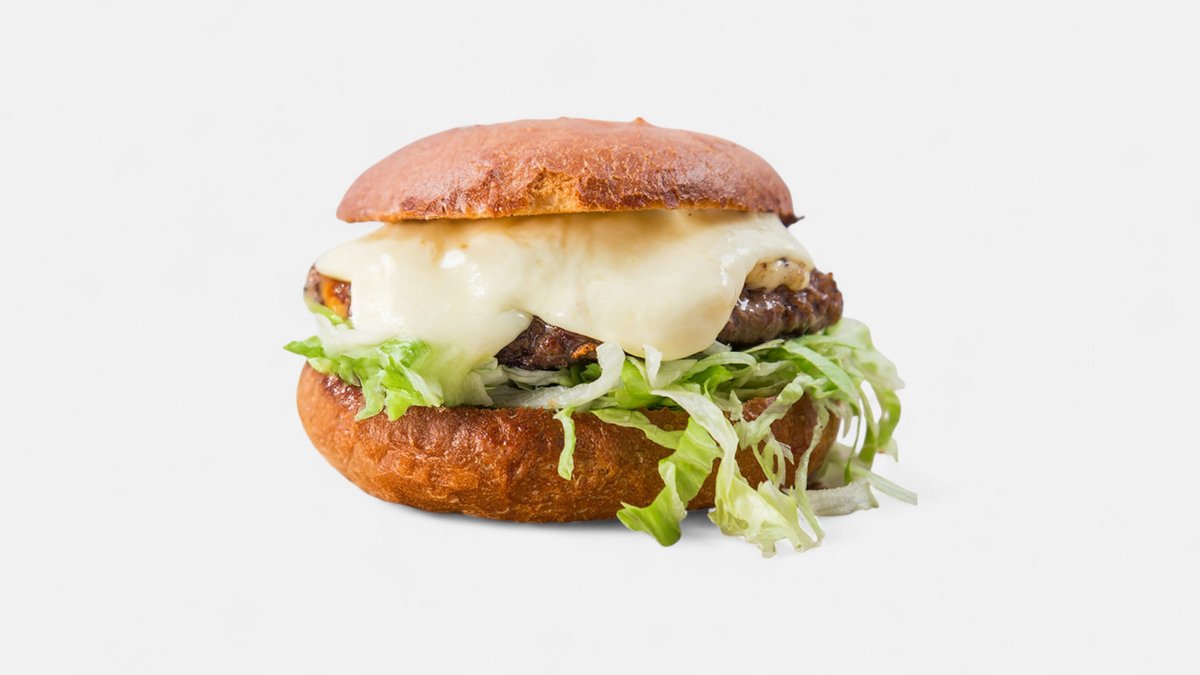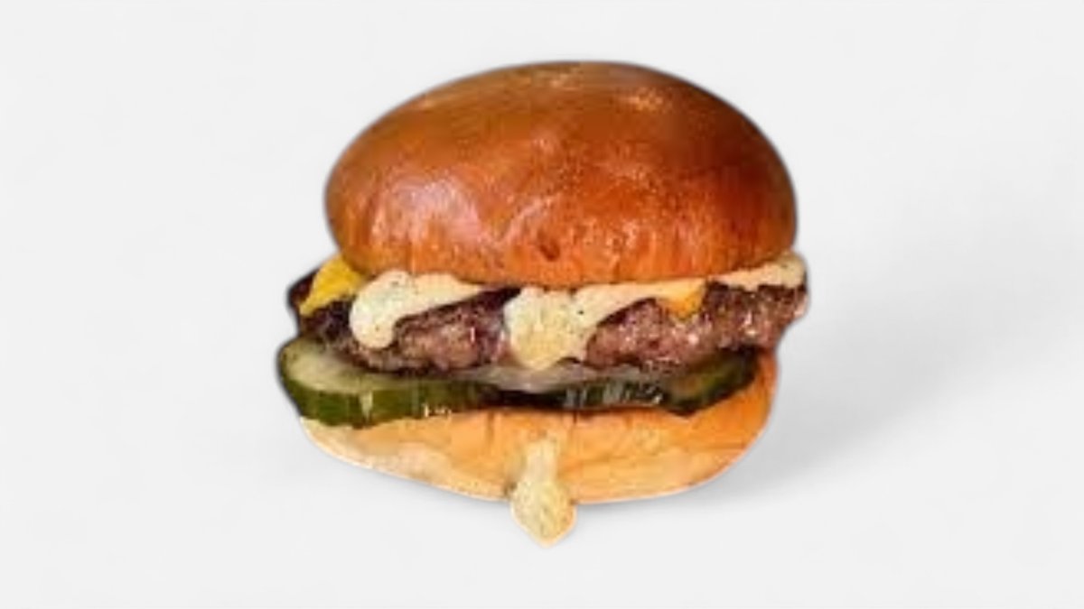 Hovězí maso 1× patty, Cheddar, smažená Sýr 1×,salat ledový, česneková omáčka, Speciální Burger Omáčka, karamelizovaná bulka.