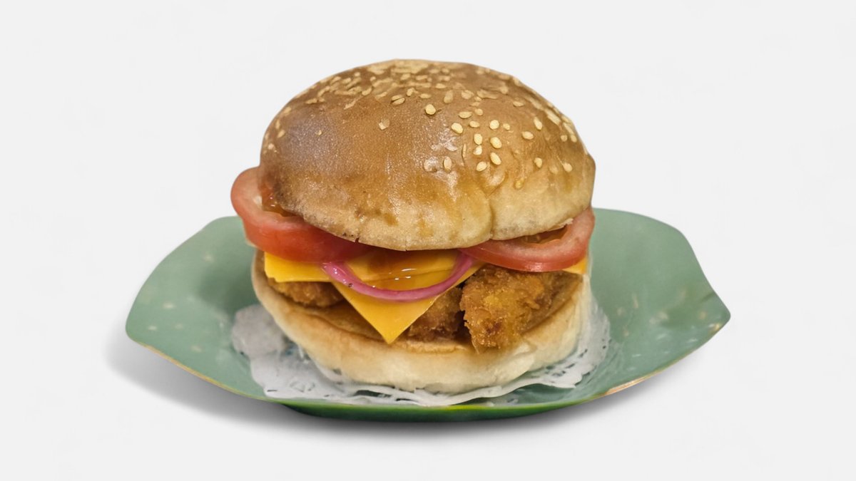 Hovezi maso 1× patty,cheddar, Rajča, salát ledový, speciální chilli omáčka , karamelizovaná Bulka,