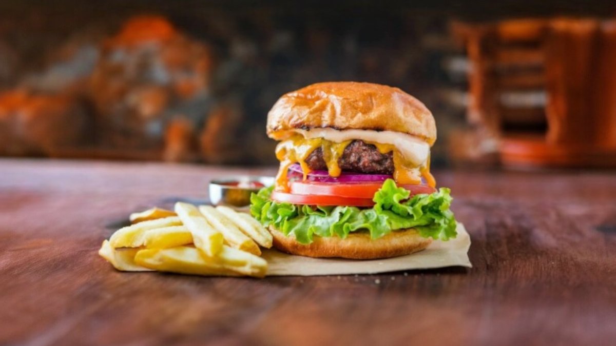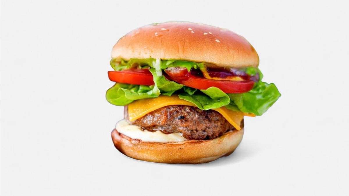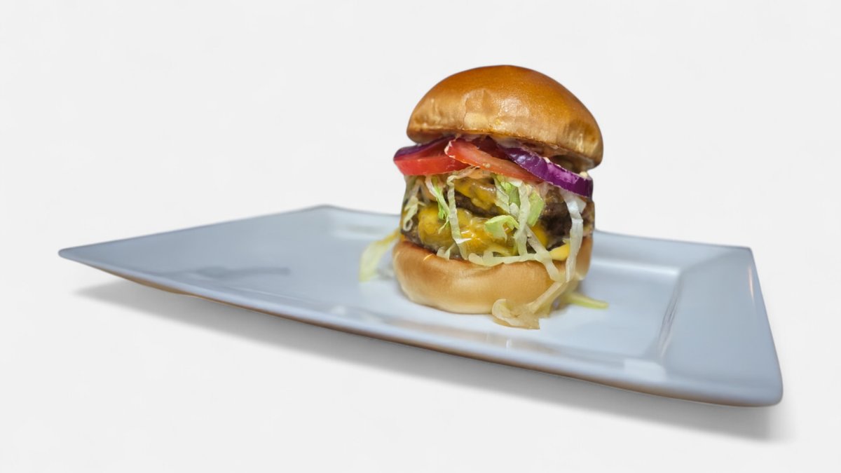 Hovezi maso 1* patty, ceddar Syr,Smažena Cibulka,ledoby salát, Rajčata, Červený Cibule ,Kacup, Majonéza,karamelizovaná bulka.