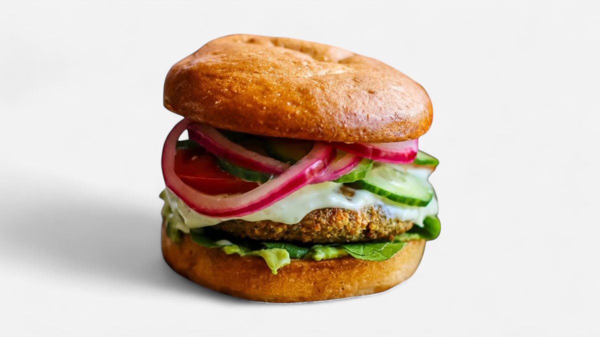 Falafel,ceddar sýr, salát ledový, rajčata,kacup, majonéza, karamelizovaná bulka
