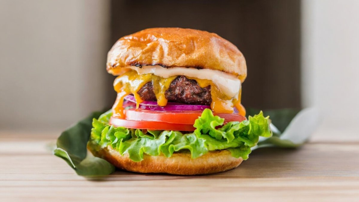 Mleté hovězí maso - 1x patty, sýr čedar, karamelizovaná cibule, omáčka Biggy Burger, salat mayo, salat,okurka, Rajca, červená cibule,karamelizovaná bulka