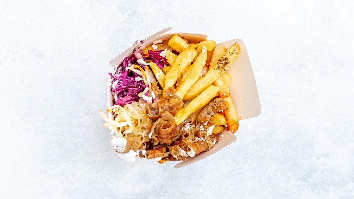 grilovaný kuřecí maso, zelenina, omáčka, hranolky / rýže / pita, kousek pity