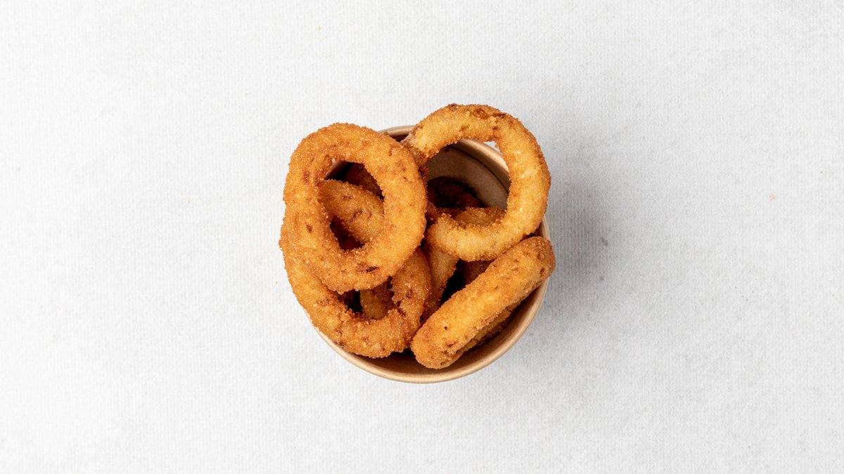 Cibulové kroužky se skládají z průřezového kroužku cibule namočené ve strouhance a poté smažené. 5 ks a 1 dip.