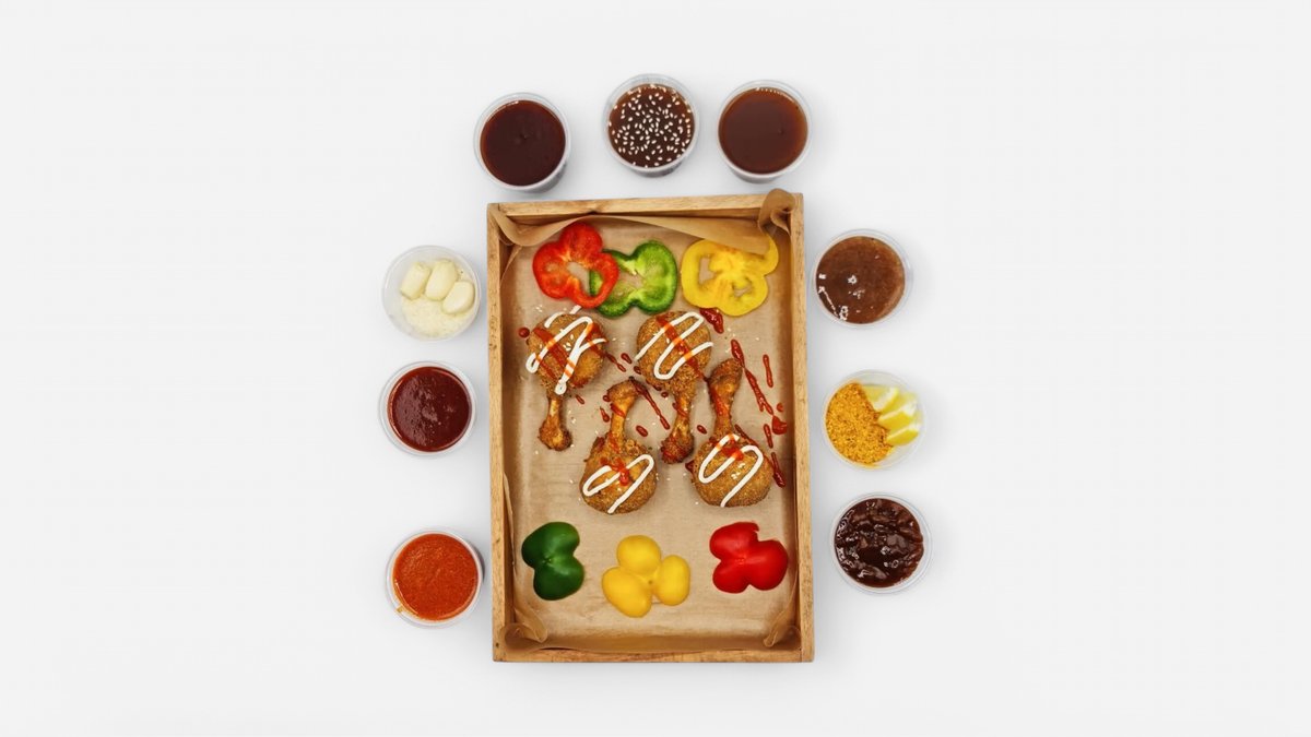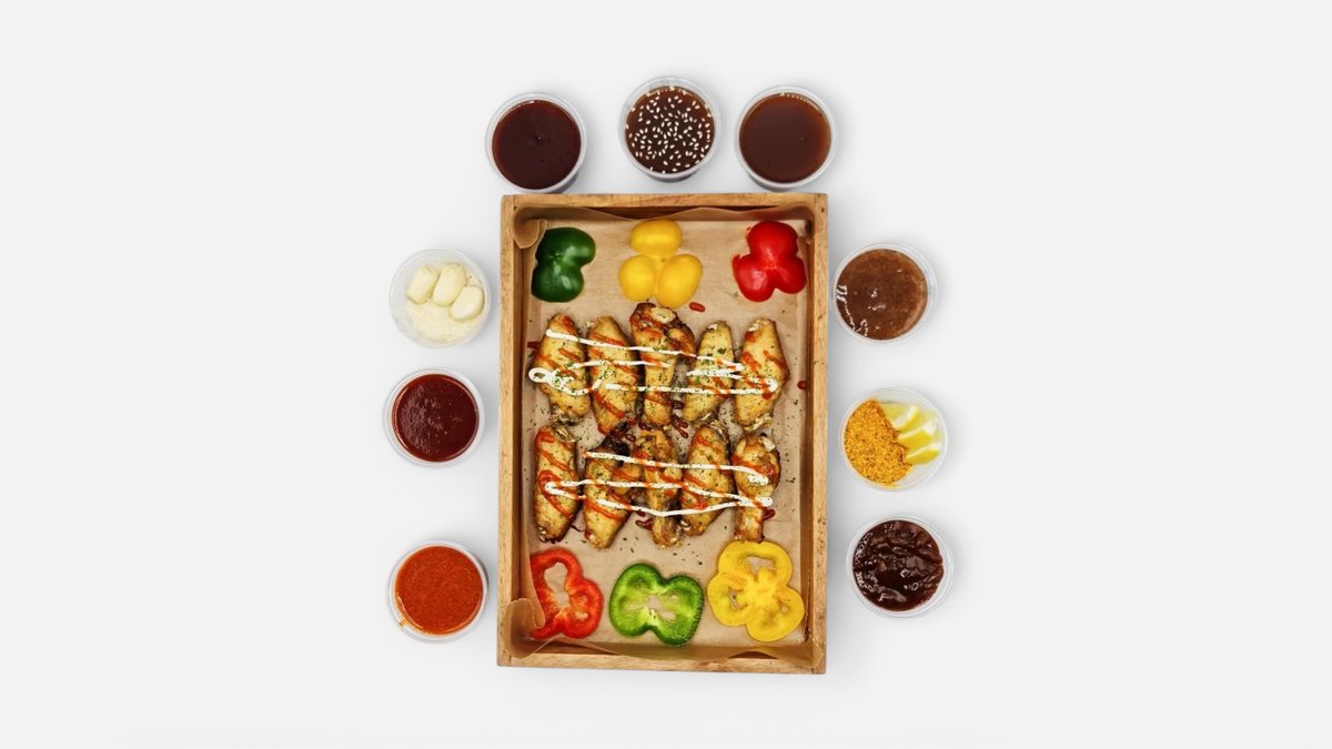 CZ: 50 ks Křídla , 2 velké hranolky, 5 omáček dle vašeho výběru. Eng: 50 pcs Wings, 2 Large Fries, 5 Sauces of your choice.