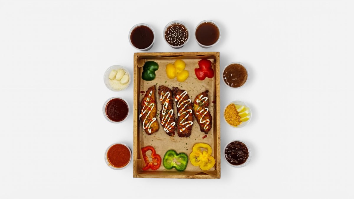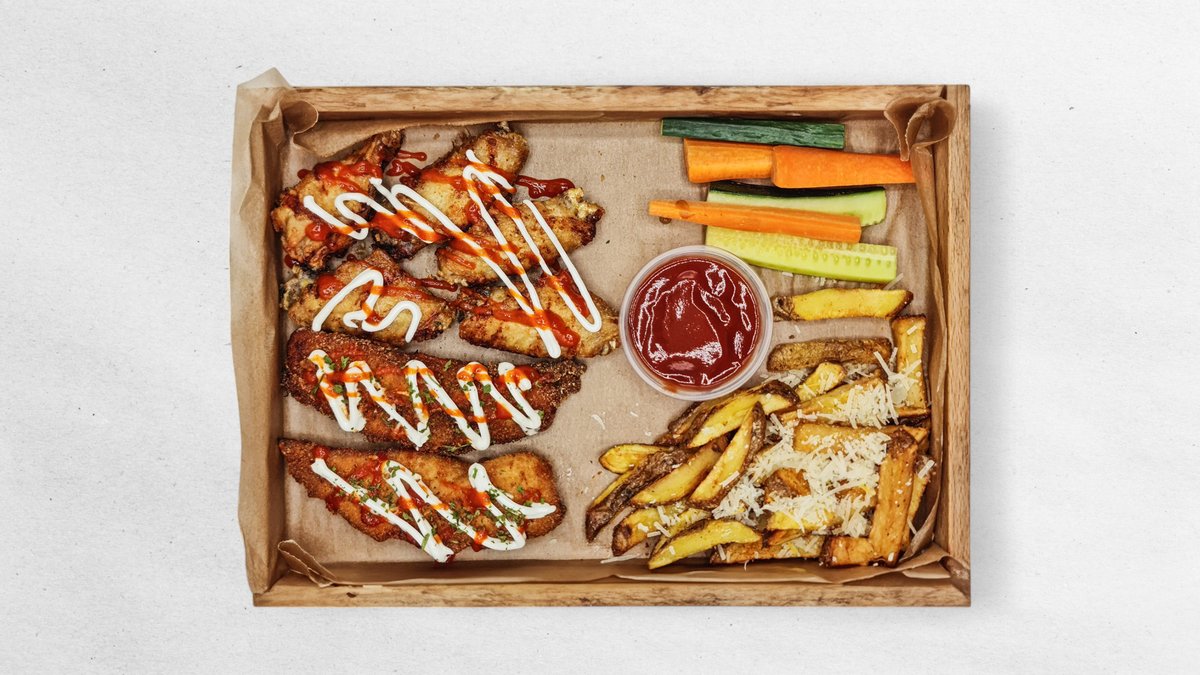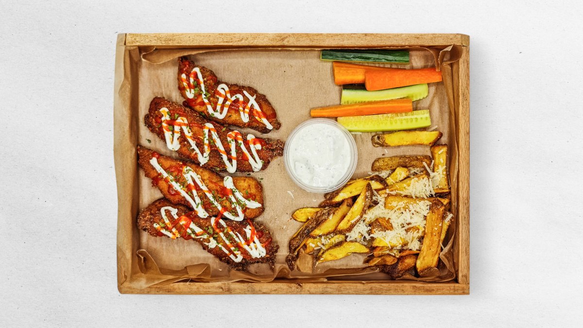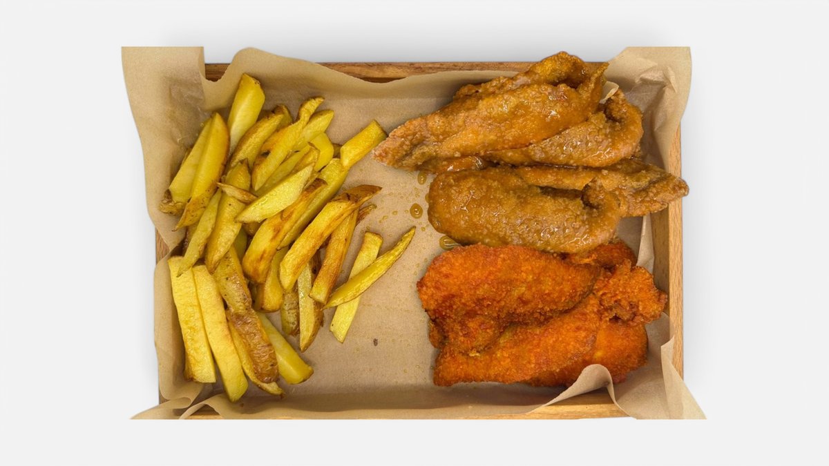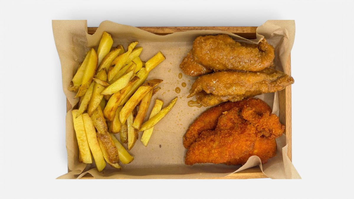 CZ: 2 ks Proužky & 5 křídla se 2 omáčkami dle vašeho výběru, malými hranolky, dipem. Eng: 2 pcs Strips & 5 Wings with 2 sauces of your choice, small fries, A dip.