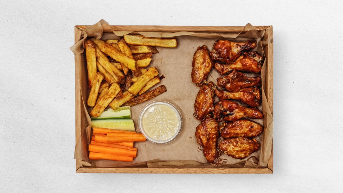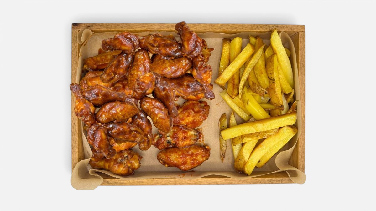 CZ: 20 ks Křídla, velké hranolky, 2 omáčky dle vlastního výběru. Eng: 20 pcs Wings, Large fries, 2 Sauces of your choice.