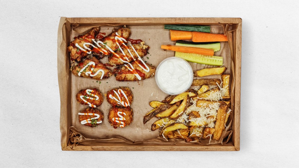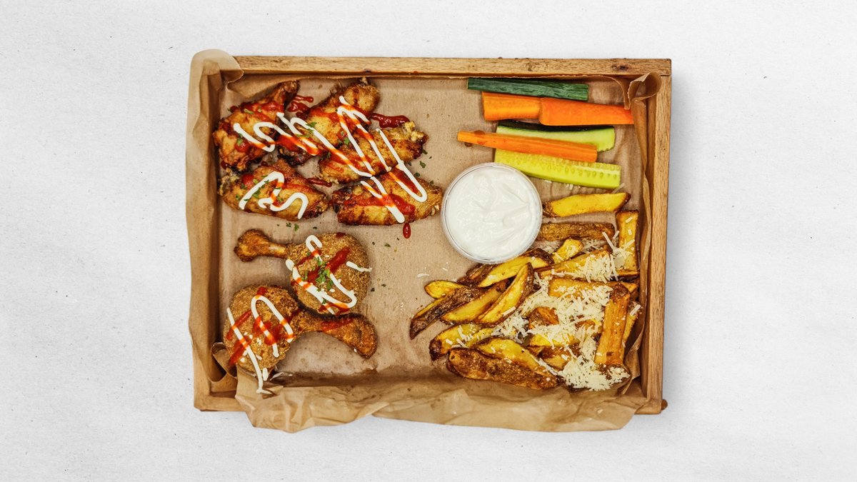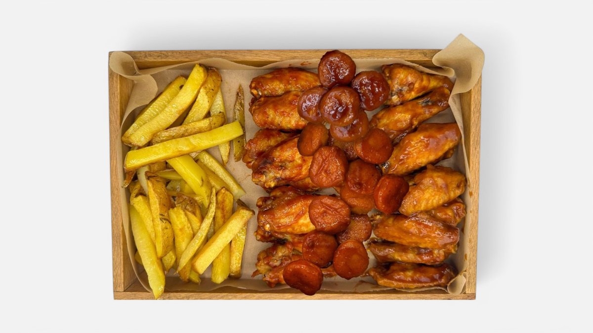 CZ: 15 ks křídel, 15 nugetů, velké hranolky, 3 omáčky dle vašeho výběru. Eng: 15 pcs Wings, 15 Nuggets, Large fries, 3 Sauces of your choice.