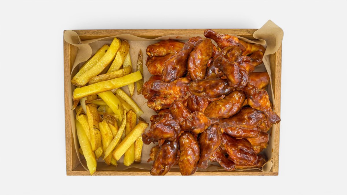 CZ: 30 ks Křídla, velké hranolky, 3 omáčky dle vašeho výběru. Eng: 30 pcs Wings, Large Fries, 3 Sauces of your choice.