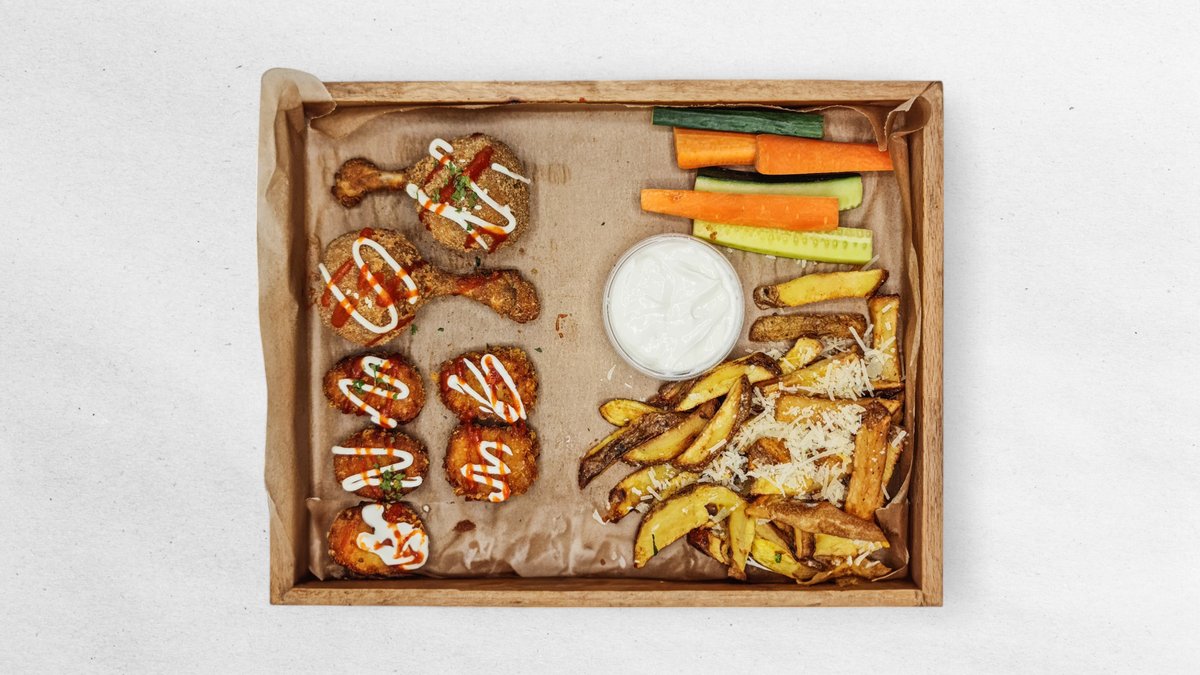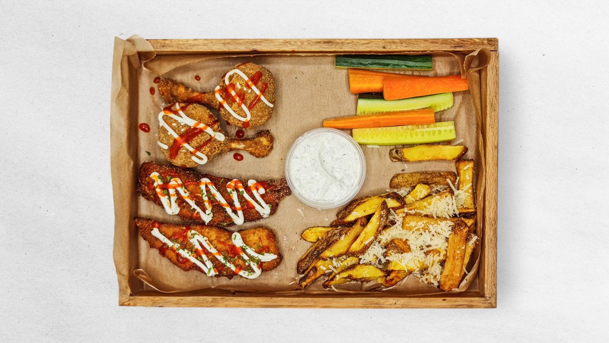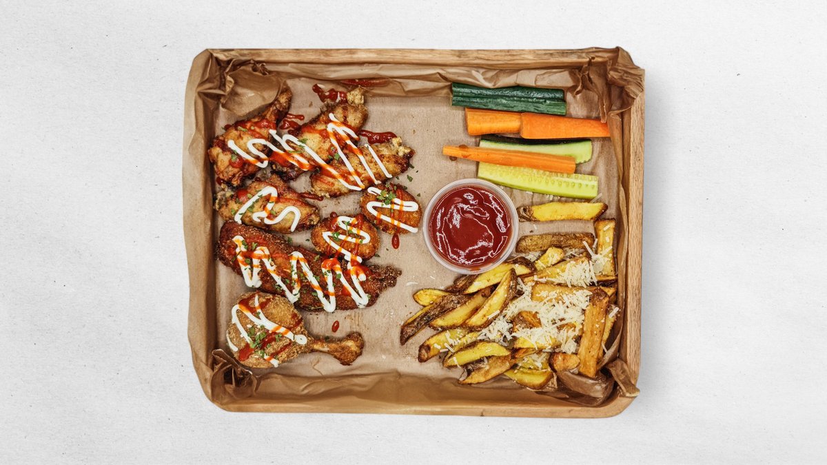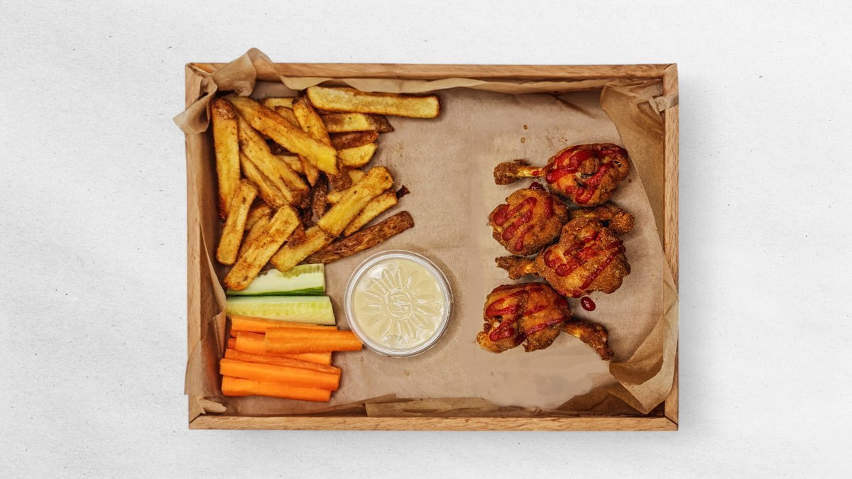 CZ: 2 ks Paliček & 5 křídla se 2 omáčkami dle vašeho výběru, malými hranolky, dipem. Eng: 2 pcs drumstick & 5 Wings with 2 sauces of your choice, small fries, A dip.