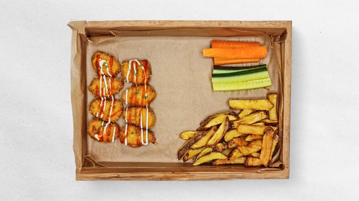CZ: 10 ks nugetů se 2 omáčkami dle vlastního výběru, malé hranolky, A dip. ENG: 10 pcs nuggets with 2 sauces of your choice, small fries, A dip.