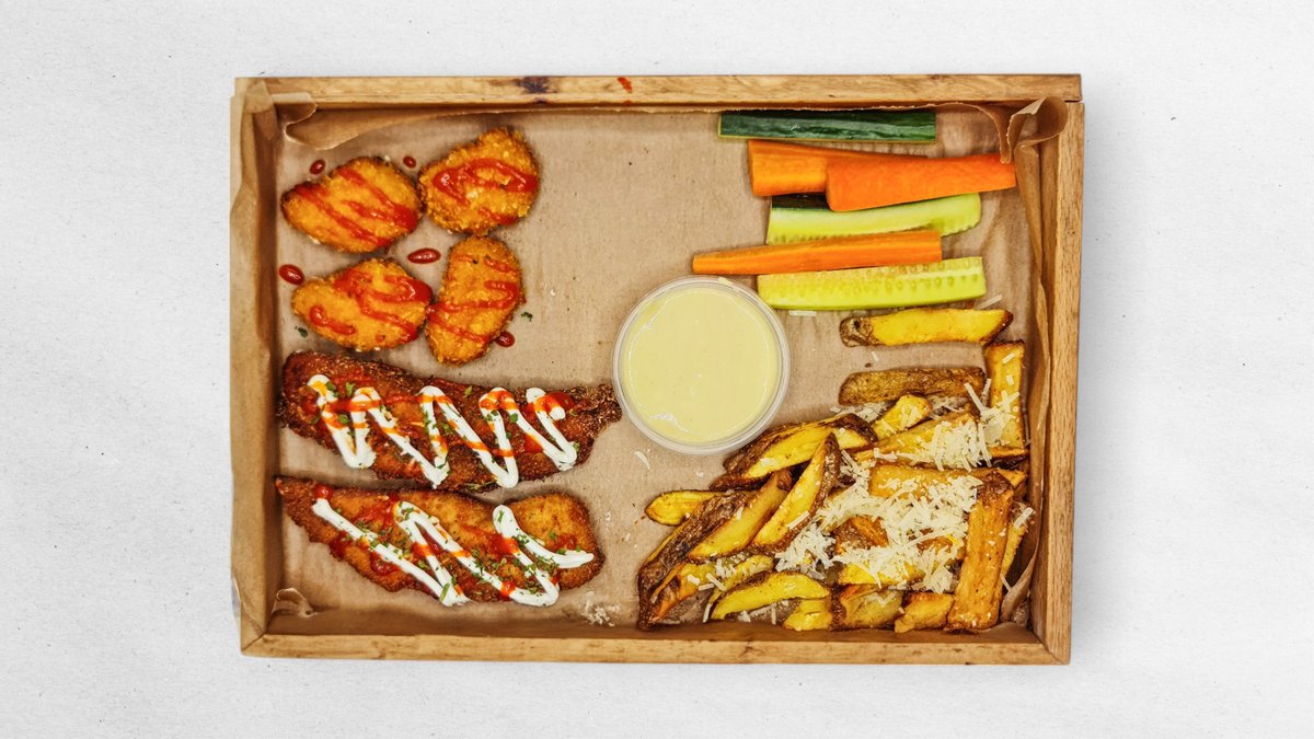 CZ: 2 ks proužek, 3 křidélka a 2 nugety se 2 omáčkami dle vašeho výběru, hranolky, dipem. Eng: 2 pcs Strip, 3 wings & 2 Nuggets with 2 sauces of your choice, small fries, A dip.