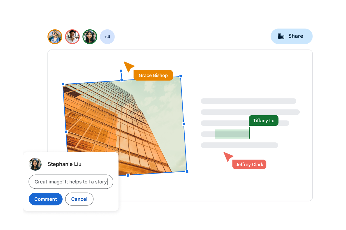 Contribuye con cambios, comentarios y aprobaciones en tiempo real, directamente desde Documentos y Presentaciones.