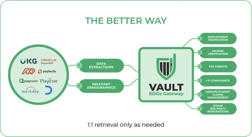 The Vault EDGe Gateway is a real-time API between our application and the HCM/payroll platform utilized by each of our clients. With enhanced precision, our clients are empowered to grant employer-sanctioned limited access for their preferred HR tech vendors, who then can securely provide requested services using sensitive HR data.